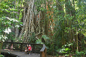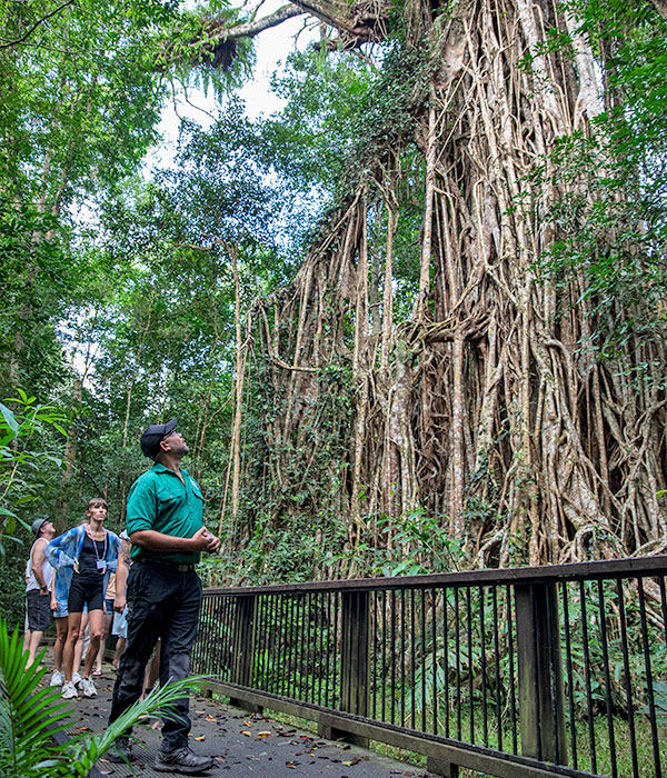 The Cathedral Fig Tree is visually breathtaking, from its impressive tangle of roots to its array of branches that reach wide into the canopy, 50m above the forest floor and are covered in ferns and vines. This 500 year-old tree is environmentally and culturally significant. Your guide will explain more of this, during the 45-minute tour with Traditional Owners.